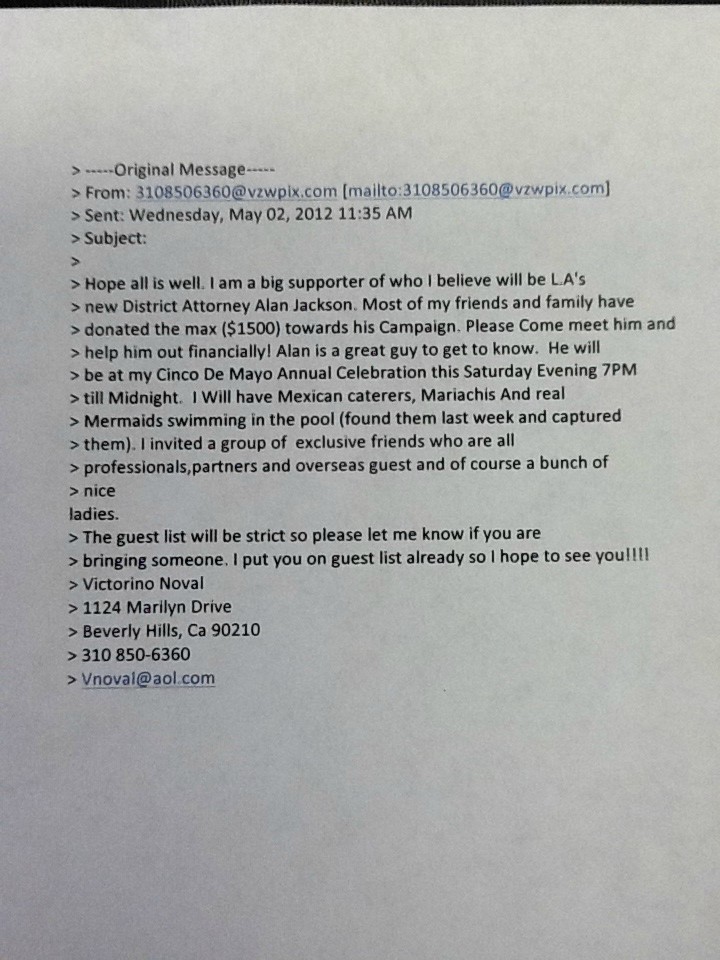“On Tuesday, The Jackie Lacey for District Attorney campaign received a copy of an invitation to the event sent out by Victorino Noval which read as follows: “I am a big supporter of who I believe will be LA’s new District Attorney Alan Jackson. Most of my friends and family have donated the max $1,500 towards his campaign. Come and meet him and help him out financially,” Skelton continued.