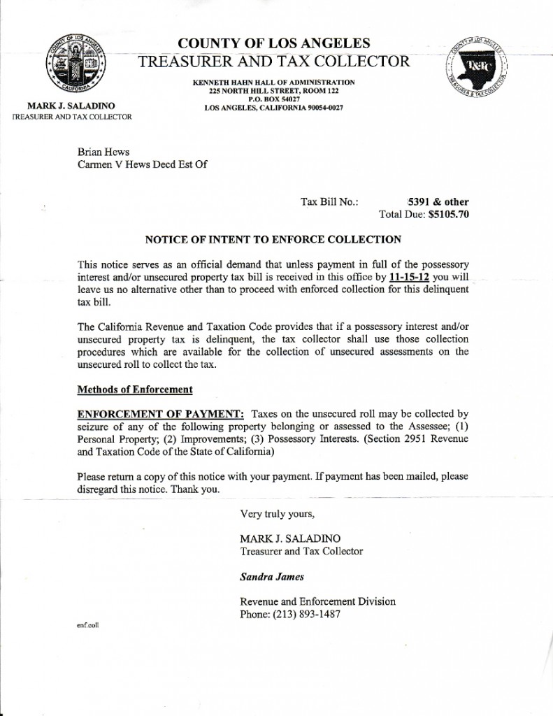 The letter, sent to Hews’ residence and referencing Carmen Hews’ Estate (Carmen Hews is Brian’s mother who passed away in Jan 2011) states, “this notice serves as an official demand that unless payment in full…. is received in this office by 11-15-12, you will leave us no alternative other than to proceed with enforced collection for this delinquent tax bill.”