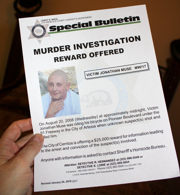 Jonathan was riding his bicycle to visit a friend when he was shot on Pioneer Boulevard under the 91 Freeway.
