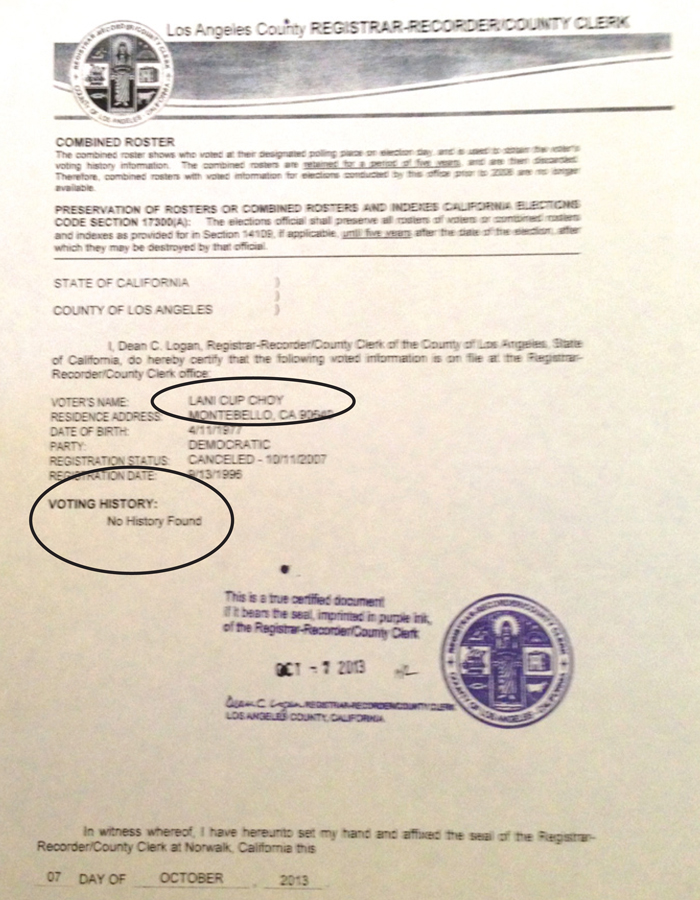 Official records obtained by Hews Media Group-Community Newspaper from the Los Angeles County Registrar of Voters confirm that Montebello Unified School Board Candidate Lani Cupchoy has never voted in a Los Angeles election.