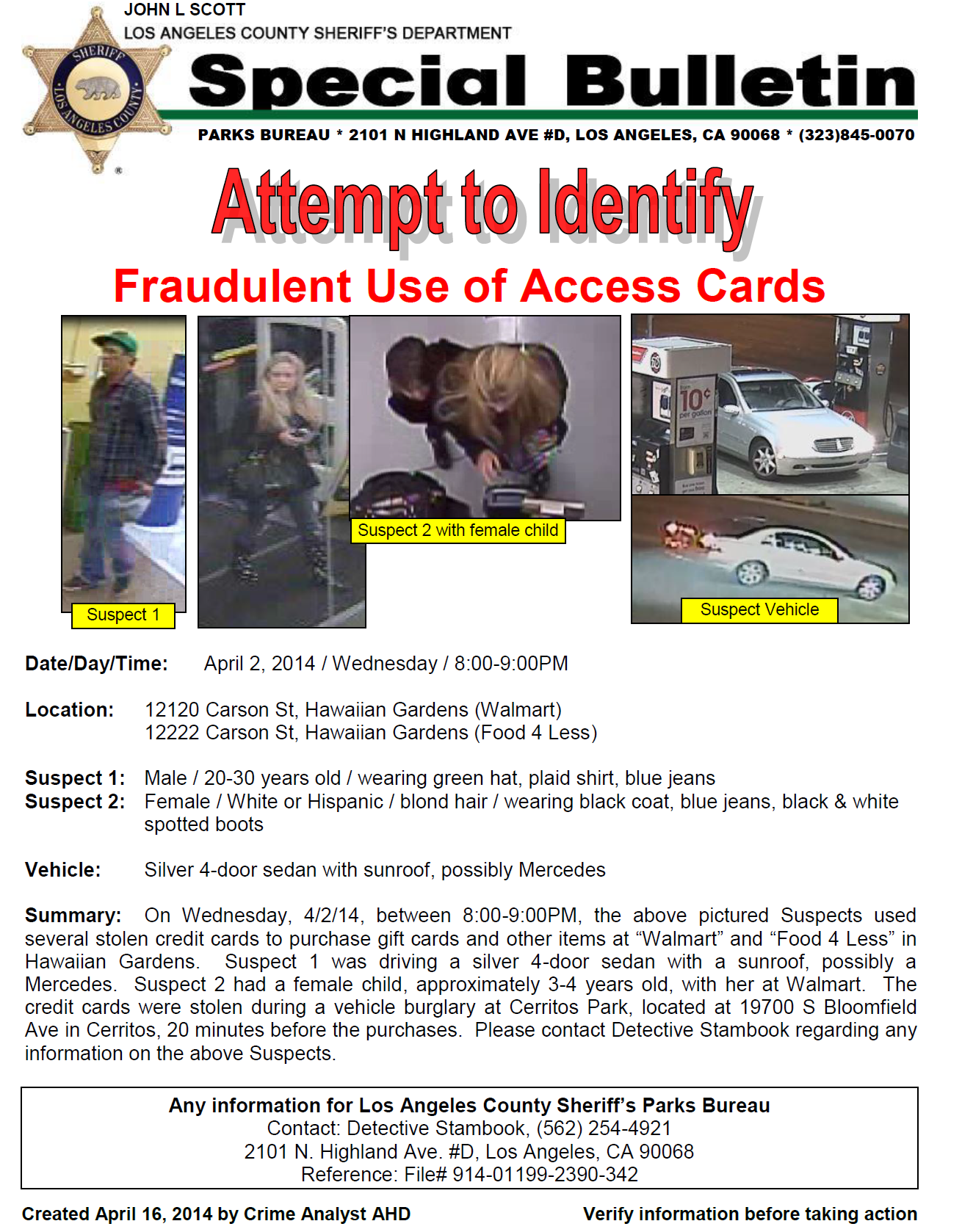 Residents in and around the Hawaiian Gardens and Cerritos area are being asked by Detectives from the Los Angeles County Sheriff’s Department Parks Bureau to be on the lookout for two suspects who are wanted for the Fraudulent Use of Access Cards.