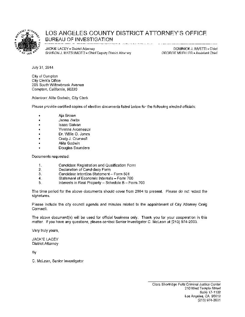 On July 31, Lacey directed Compton City Clerk Alita Godwin to turn over several different documents pertaining to Mayor Aja Brown and City Council members Janna Zurita, Isaac Galvan, Yvonne Arceneaux and Dr. Willie O. Jones.