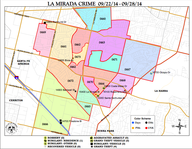 A motorcycle was reported stolen from the 15400 block of La Mirada Blvd. A vehicle was reported stolen from the 14900 block of Costa Mesa Dr. A sports utility vehicle was reported stolen from the 15300 block of Santa Gertrudes Ave. The vehicle was recovered the same day after being stripped by the Huntington Beach Police Department.