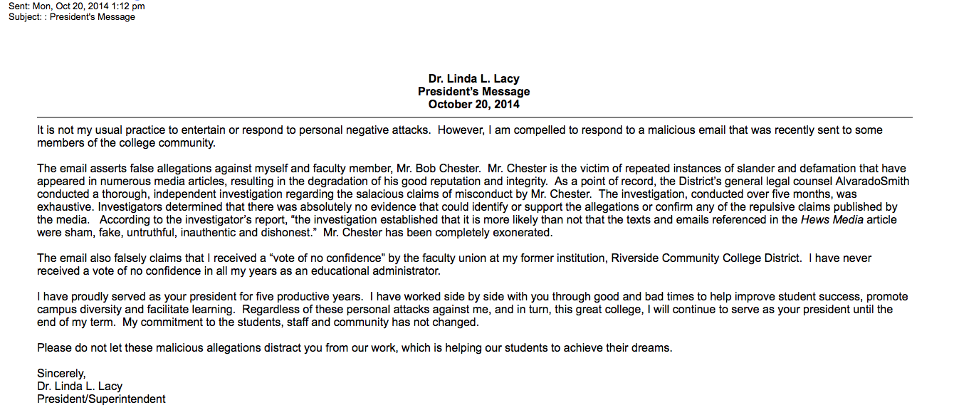 Lacy went on to say, “The email also falsely claims that I received a ‘vote of no confidence’ by the faculty union at my former institution, Riverside Community College District. I have never received a vote of no confidence in all my years as an educational administrator. I have proudly served as your president for five productive years. I have worked side by side with you through good and bad times to help improve student success promote campus diversity and facilitate learning. Regardless of these personal attacks against me, and in turn, this great college, I will continue to serve as your president until the end of my term. My commitment to the students, staff and community has not changed,” Lacy wrote.