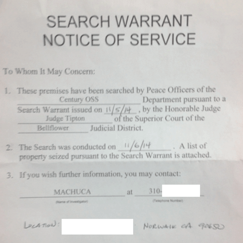 The document stated, “ These premises have been searched by Peace Officers of the Century OSS (Operation Safe Streets) pursuant to a search warrant issued on November 5, 2014 by Hon. Judge Tipton of the Superior Court of the Bellflower Judicial District.