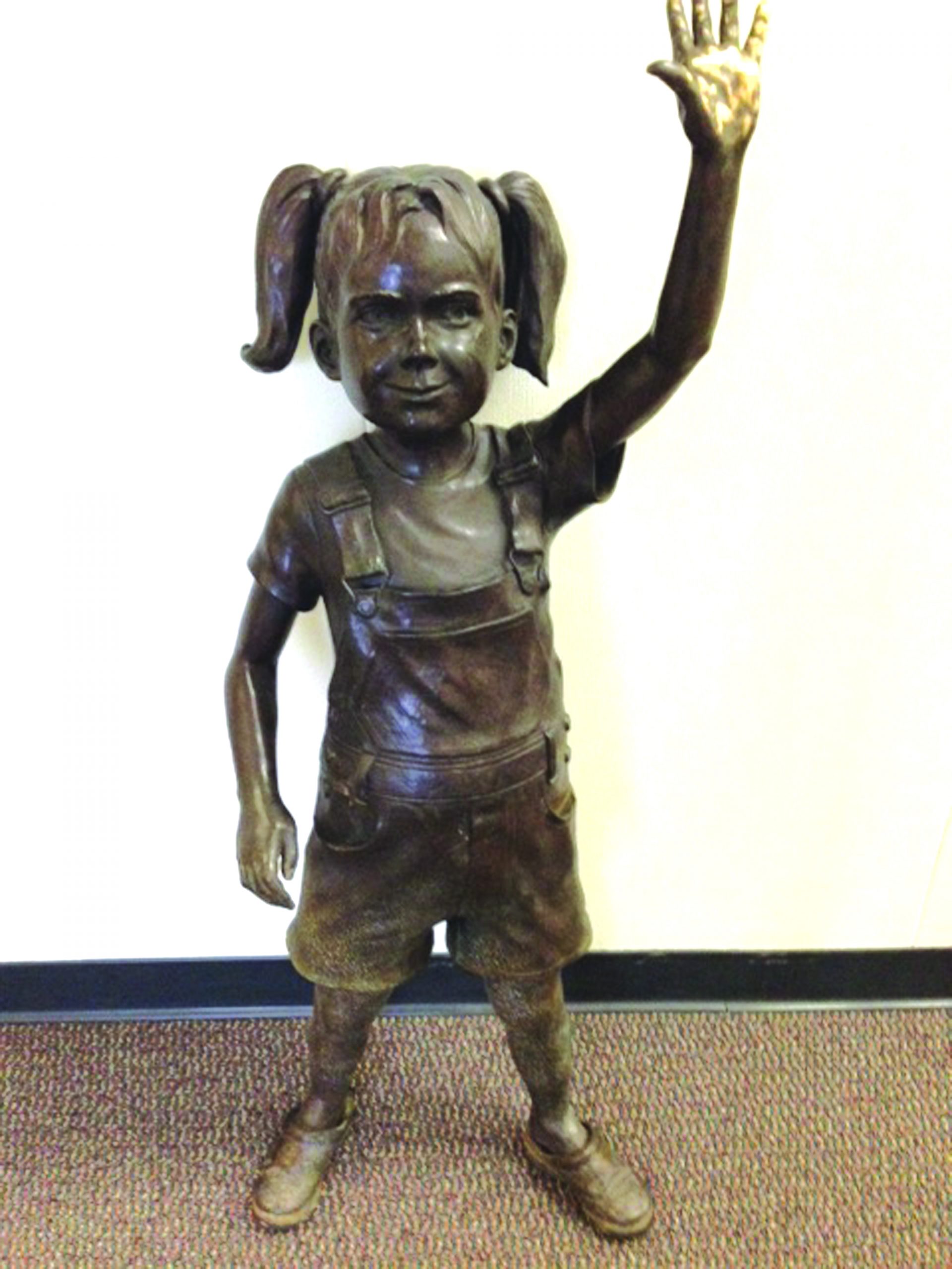 A bronze sculpture reported missing from Norwalk’s Civic Center Lawn has been located and returned to the City. The location of the waving, pigtailed young girl in suspenders was reported by an Anaheim metals recycling center upon learning that the piece was registered stolen on the website scraptheftalert.com, a tool used by law enforcement to communicate theft to the scrap metal industry.
