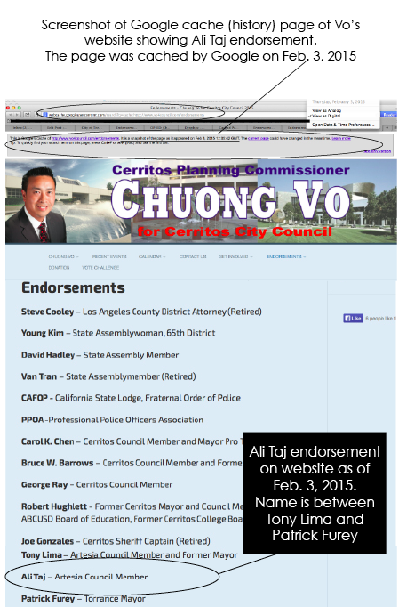 The link below is Vo’s endorsement page on his website from Cachedpages.com, dated of Feb. 3, 8:05 AM PST.