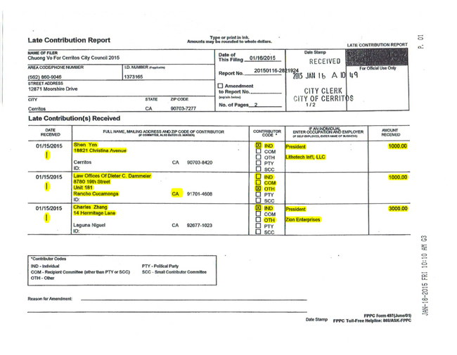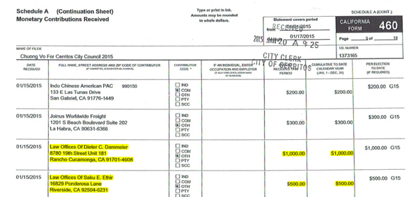 HMG-CN also found that Vo received $6,000 from other dubious supporters who did not reside in Cerritos, one of whom donated $5,000 to Cerritos Mayor pro tem Carol Chen’s campaign in 2013.