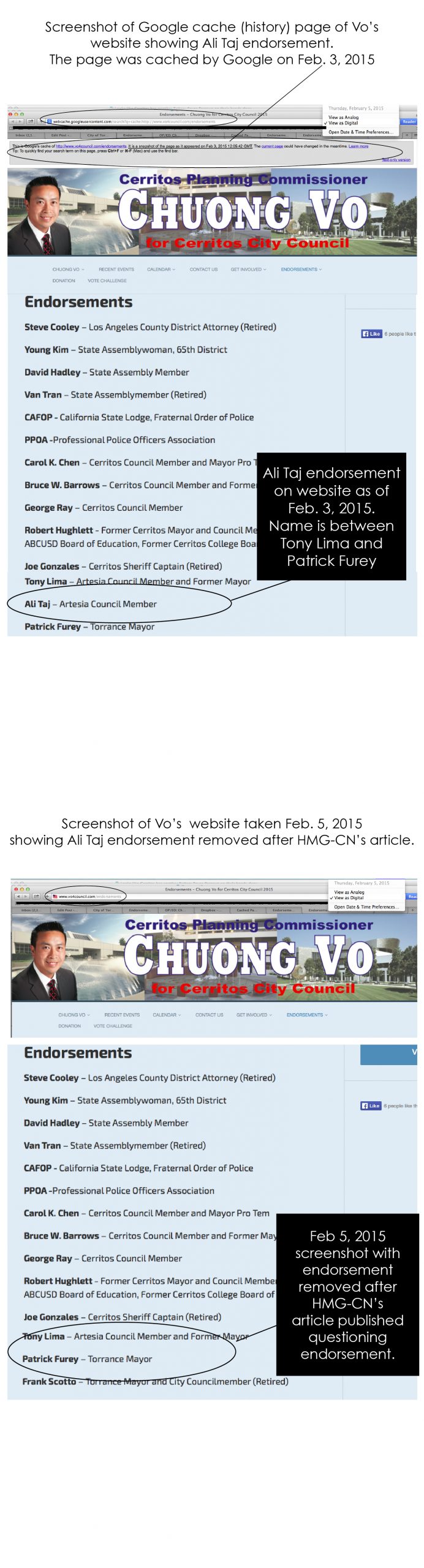 New facts and evidence have been uncovered by HMG-CN that show that Vo knew Councilman Taj was a bogus endorsement, that Vo attempted to cover it up, and, as further evidence, did not bring the subject up during his public closing statement blasting HMG-CN where he said the “entire story was a lie.”