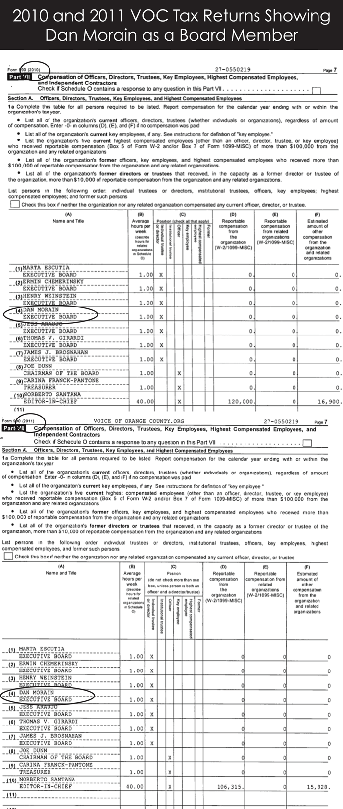 When informed that Morain was listed on VOC’s 2010 and 2011 tax returns as a board member and asked if he knew of a letter of resignation from Morain, Santana said in a later email, “Dan verbally resigned from our board very early, like Jan. of 2010…his listing on the 2011 tax form is a clerical error on our part.”