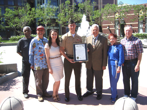 Shown in the picture from left to right are Lew Woodson, Mickey Christiason (host), Jessica (wife) & Sgt Samuel Wettstein, Cerritos City Councilman George Ray , Dorothy Owen (president for the 1st CEB Adoption Committee), and Chris Tierheimer.