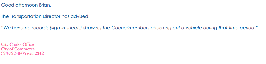 In addition, a public records request showed that the Mayor pro tem never signed the car out or in on Dec 11 as per the city’s Transportation Department. The answer of the public records request from the Transportation Department is attached.”