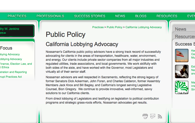 A review of Nossaman’s website by HMG-CN found that the firm had previous connections with the Calderon family, “…Nossaman advisors are well respected in Sacramento, reflecting the strong legacy of former Senators Dick Ackerman, John Foran, and Charles Calderon, former Assembly Members Jack Knox and Bill Bagley, and California’s longest serving Legislative Counsel, Bion Gregory.