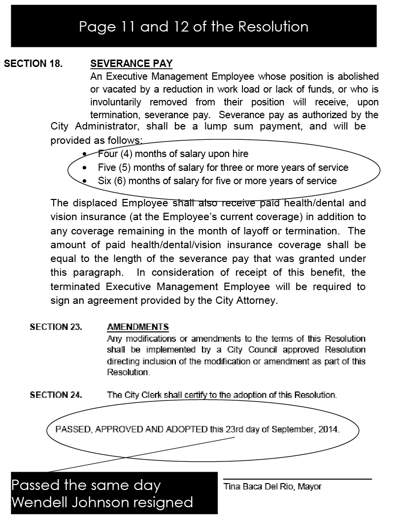 Johnson resigned September 23, 2014, presumably during normal working hours, the Resolution, passed and dated September 23, 2014, could only be passed at Council Meetings, which occur at 6 p.m. or later, so therefore Baca Del Rio, Olivo, and anyone else connected with the Release could have stopped the implementation and saved $35,000.