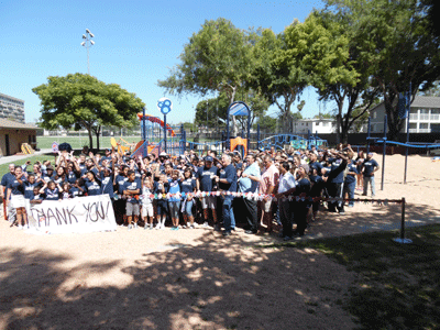 Currently, many of the children served by the City of Bellflower do not have updated, safe and accessible play spaces. This new playground will replace old play structures and give the children the balanced and active play they need to thrive. The design is based on children’s drawings created at a special design event in April. New sandboxes, swings, slides and gym structures were accented by painted sidewalks, with hop scotch, tic-tac-toe, twister and and an interactive gadget wall.