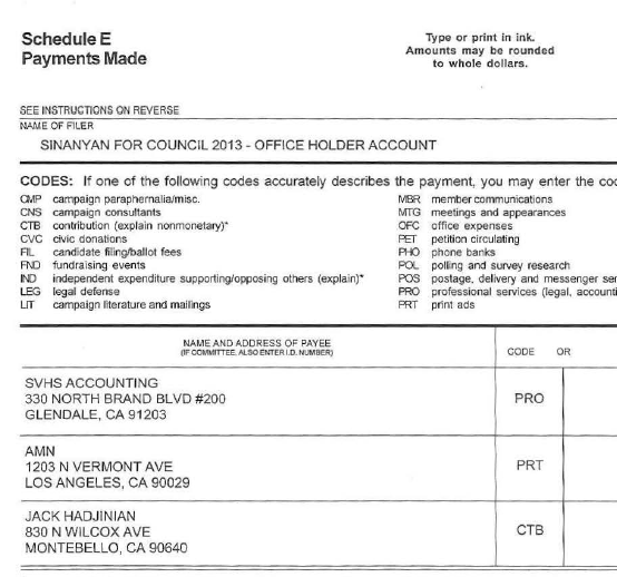 Acting on a tip, HMG-CN pulled Sinanyan’s 460 “Office Holder” campaign finance documents and found that Hadjinian’s donation occurred sometime in the first half of 2014.