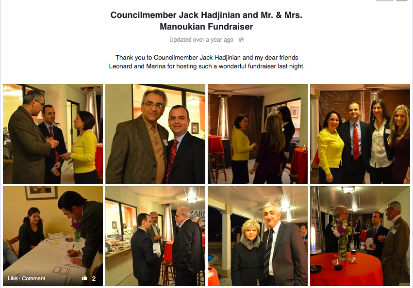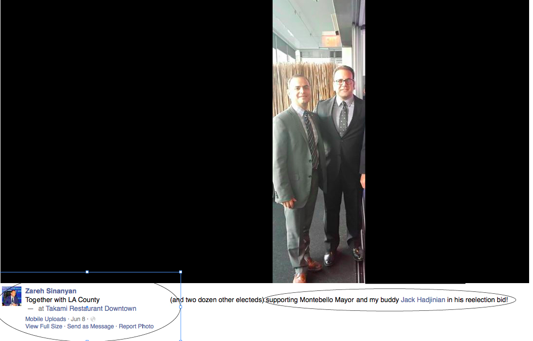 A June 8, 2015 picture post by Sinanyan on his Facebook page shows Sinanyan at a Hadjinian campaign fundraiser event with the comment, “together with…(and two dozen other electeds) supporting Montebello Mayor and my buddy Jack Hadjinian in his reelection bid!