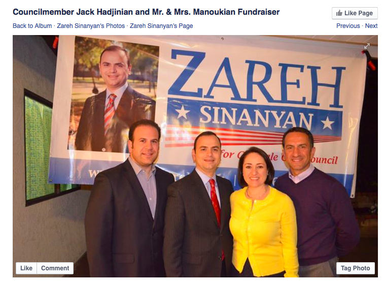 Hadjinian sponsored a fundraiser for Sinanyan held at the Glendale home of Marina and Leonard Manoukian for Sinanyan’s successful 2013 City Council campaign.