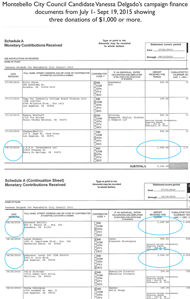 Vanessa Delgado, who is endorsed by Hadjinian, failed to report three donations of $1,000 or more. The donations were related to Primstor, the development company she works at.