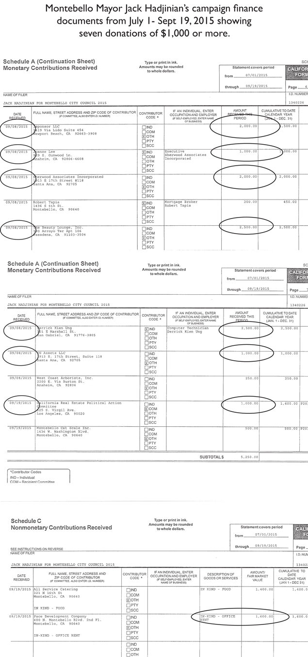 Hadjinian also received a $1,600 “in-kind” donation from Phil Pace who owns several properties in Montebello. Pace has development projects in Montebello awaiting approval from City Council.