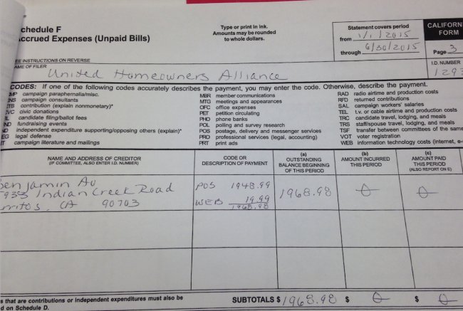 The United Homeowner’s Alliance, led by Cerritos resident Ben Ao, who, according to documents, is still owed almost $2,000 by the UHA, spent $8,000 to fight the bond. The $8,000 spent is more than six of the eight current candidates have amassed in total for their 2015 campaigns.