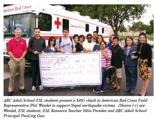 ABC Adult School Principal PaoLing Guo also thanked the students for their generosity and said, “We have great students at ABC Adult School, and when they heard of the terrible occurrence in Nepal, they wanted to get involved in some way to make a difference in peoples’ lives.”