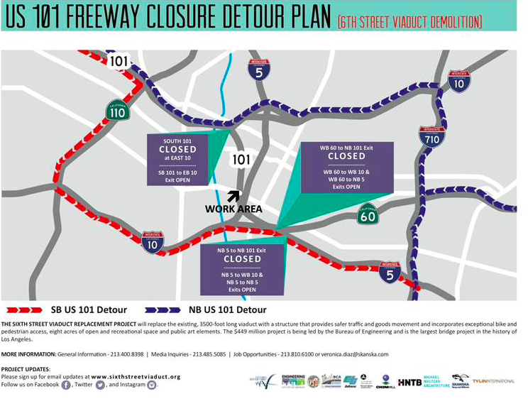Demolition of the viaduct begins this weekend with the removal of a section located over the 101 Freeway, making it necessary for the City to close a 2.5-mile stretch of the freeway through Downtown Los Angeles. The closure will begin Friday at 10 p.m. February 5th and end on Sunday, Feb. 7th at 2 p.m.