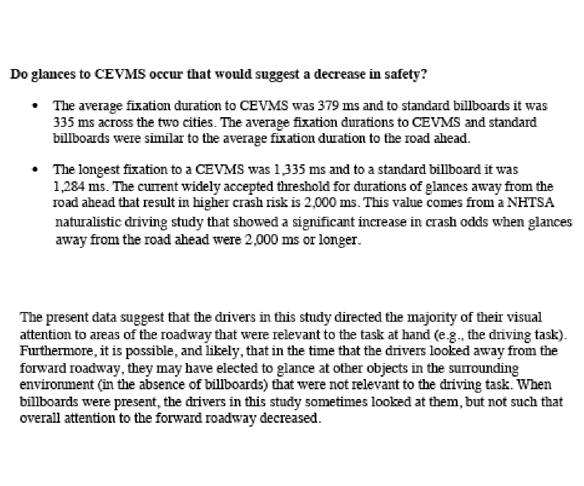 Further, HMG-CN researched and obtained a September 2012 US Department of Transportation study that “indicated that there was no consistent evidence that electronic billboards present a safety or distraction effect.”