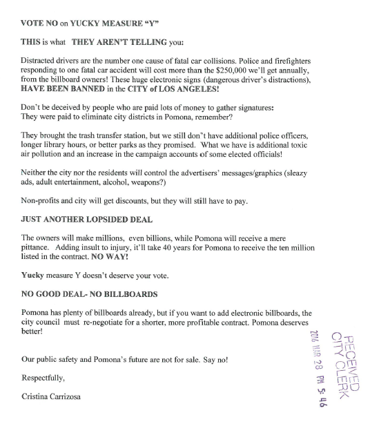 Carrizosa has filed two Argument and Rebuttal forms with the Pomona City Clerk against the measure – the first volley of lies and falsehoods – all inexplicably aimed at defeating the measure. Two copies are below.