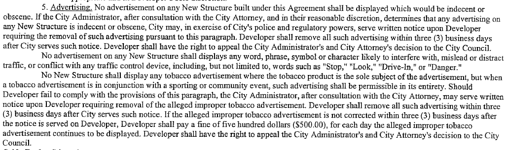 The ballot measure states, “No advertisement on any new structure built under this agreement shall be displayed which would be indecent or obscene. The City may serve written notice and developer (Bulletin) shall remove all such advertising deemed offensive within three days or be fined $500 each day after that.”