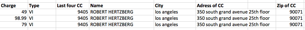 Hertzberg was subsequently told after his first comment that the card had the Mayer-Brown address of 350 S. Grand with a Suite number of 250, and that the card used was in his name, Robert Hertzberg.