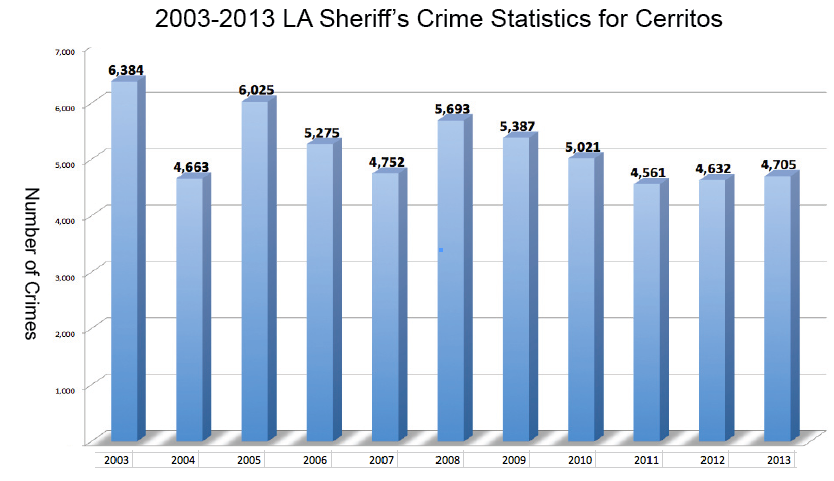 A synopsis of LA County Sheriff’s crime statistics, only reported as of year-end 2013, shows a total of 4,705 crimes in 2013 versus 6,384 crimes in 2003.