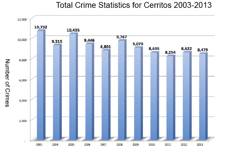 The chart below outlines 2003-2013 total crimes in Cerritos and shows an overall drop of 2,253 crimes in Cerritos over the time period, with a math discrepancy due to LA Sheriff’s data only reported through 2013, with FBI through 2014.