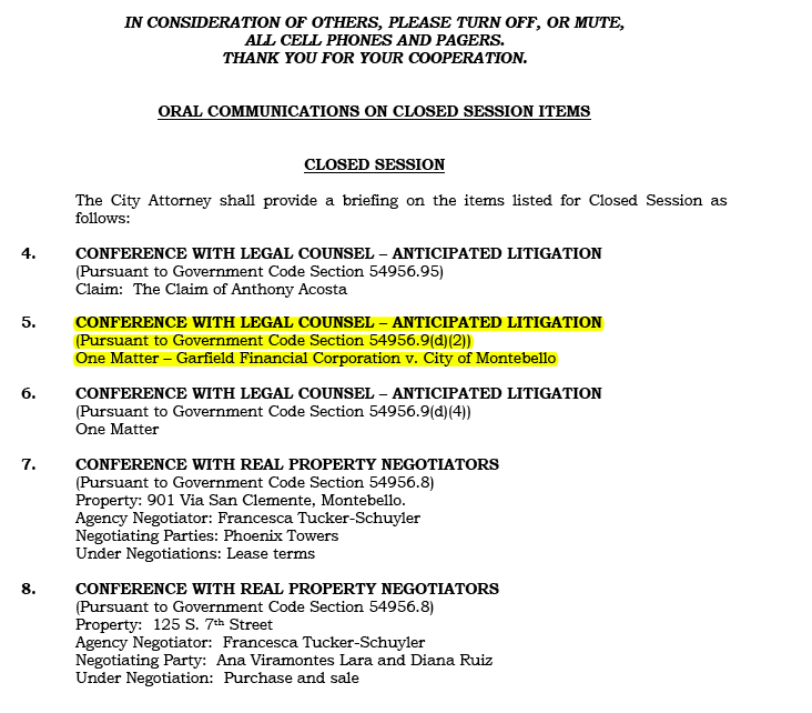 The Montebello City Council will discuss “anticipated litigation” in closed session tonight related to Garfield Financial and its owner Michael Minasian according to the City Council agenda currently online.