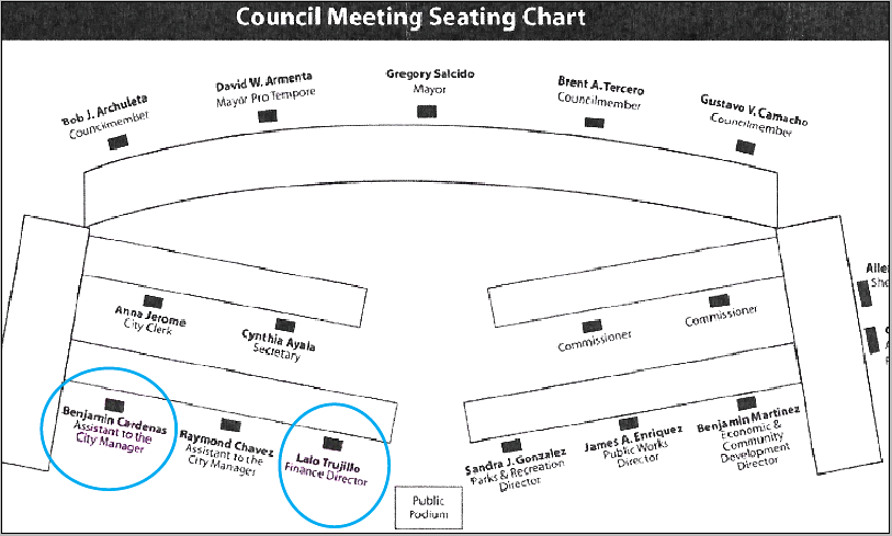 A Pico Rivera Council Meeting Seating Chart, obtained by HMG-CN and dated February 2015, shows that Cardenas sat at the same table during Council meetings.
