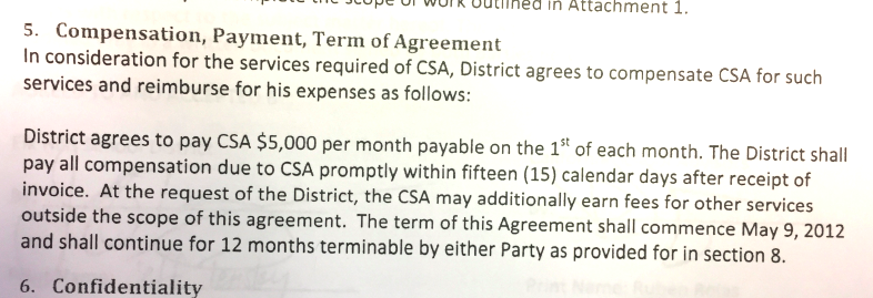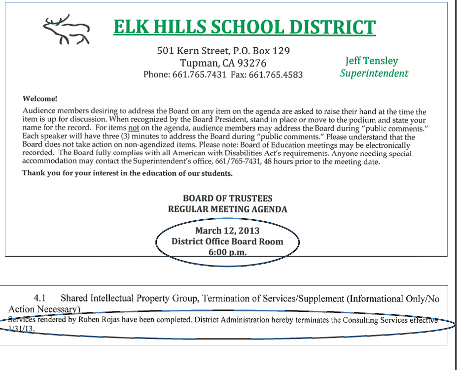 $5,000 consulting contract between Elk Hills and California School Advisors, whom Rojas worked for. Later he, and the Superintendent of Elk Hills, Jeff Tensley assigned the contract to Rojas’ own company Shared Intellectual Property Group.