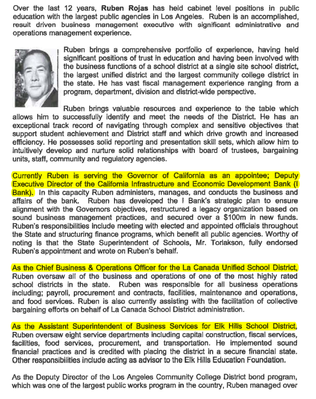 Rojas listed his next position as Chief Business Officer with the La Canada Unified School District working from July 2013 – coinciding with his “departure” from Elk Hills – to Oct. 2013, earning a hefty $12,000 per month.