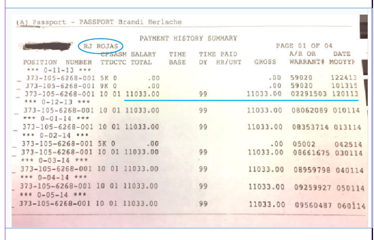I-Bank Warrant Register showing Rojas’ paychecks beginning in Dec. 2013.