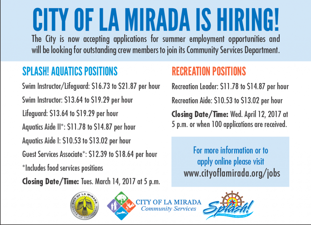Splash! in the city of La Mirada is hiring for multiple positions, see their listing below.