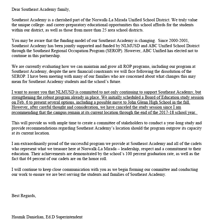 The letter states, “You may be aware that the funding model of our Southeast Academy is changing. Since 2000-2001, Southeast Academy has been jointly supported and funded by NLMUSD and ABC Unified School District through the Southeast Regional Occupation Program (SEROP). However, ABC Unified has elected not to continue in this partnership.”