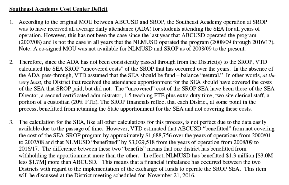 “The ABCUSD ‘benefitted’ from not covering the cost of the Academy program by approximately $1,688,756 over the years of operations through 2008 and that NLMUSD ‘benefitted’ by $3,029,518 from the years of operation from 2008-‘17. The difference between these two ‘benefits’ means that one district has benefitted from withholding the apportionment more than the other. In effect, NLMUSD has benefitted $1.3 million [$3.0M less $1.7M] more than ABCUSD. This means that a financial imbalance has occurred between the two Districts with regard to the implementation of the exchange of funds to operate the Academy.”