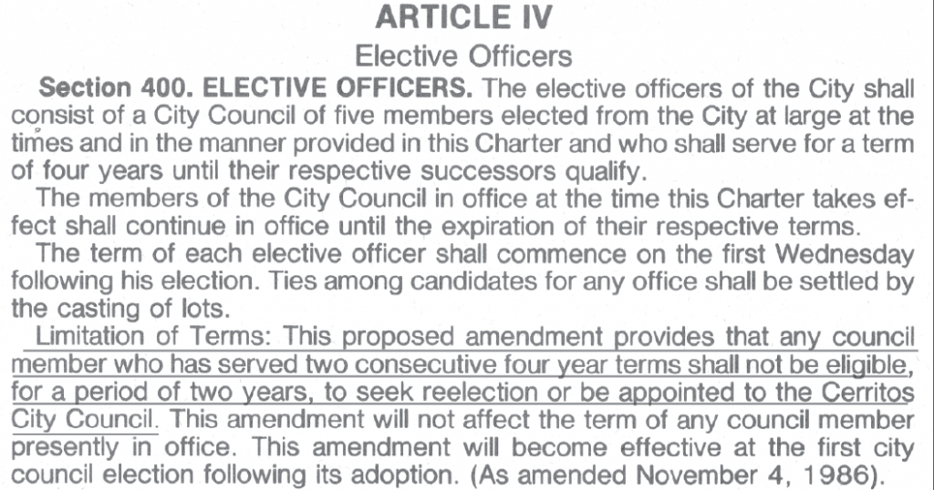 The paragraph states “any Council member who has served two consecutive four year terms shall not be eligible for a period of two years to seek reelection or be appointed to the Cerritos City Council.”