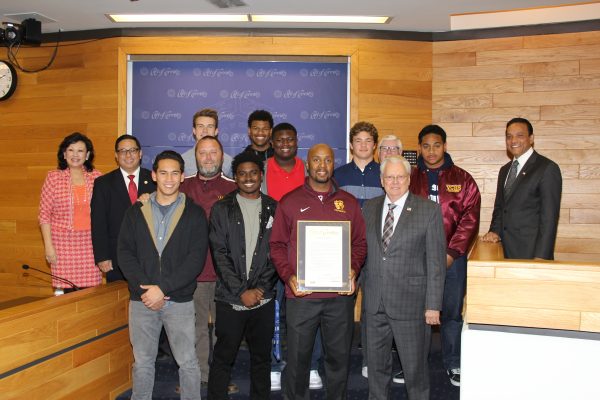 The Valley Christian High School Crusaders football team was recognized by the Cerritos City Council on being named the Olympic League Champions.