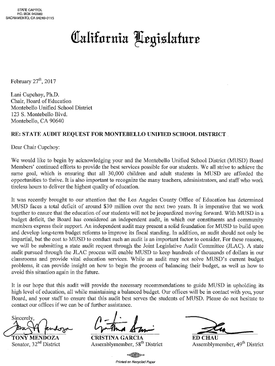 State Senator Tony Mendoza, Assemblywoman Cristina Garcia, and Assemblymember Ed Chau’s letter to the MUSD Board.