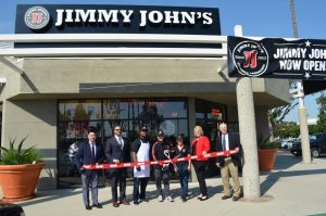 Jimmy John’s Gourmet Sandwiches opened at 30 Centerpointe Drive, La Palma. From (l-r) La Palma City Council member Peter Kim La Palma City Council member Marshall Goodman General Manager Bryce Batton Store Owner Jesse Raynes Area manager Sharon Schifino-Gray La Palma Mayor Michele Steggell La Palma City Council member Gerard Goedhart