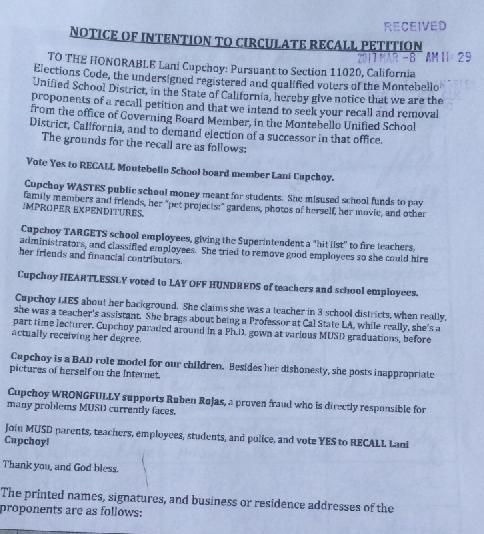 Hews Media Group-Community News has obtained two Notices of Intention to Circulate a Recall Petition (Notices) filed to recall MUSD Board member Ben Cardenas and Board President Lani Cupchoy.