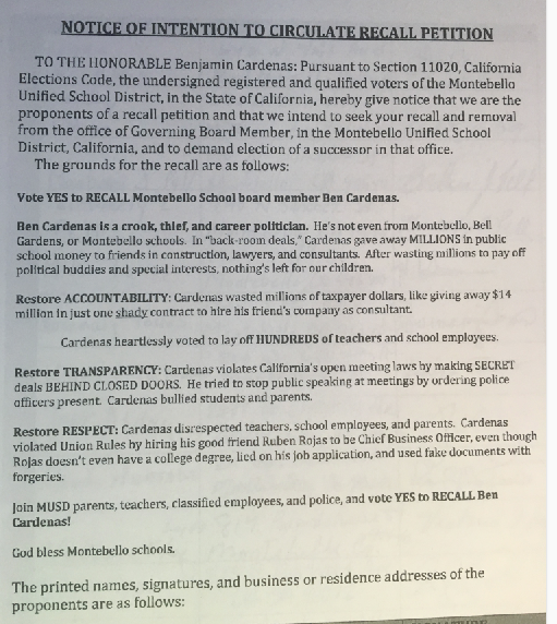 The recall document slammed Cardenas as a “crook, thief, and career politician. He’s not even from Montebello, Bell Gardens, or Montebello schools. In backroom deals, he gave away millions in public school money to friends in construction, lawyers, and consultants. After wasting millions to pay off political buddies and special interest, nothings is left for our children.”