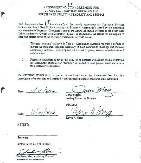 In December 2001, Hunt made a “special presentation” of his first original bid to the South Gate Utility Authority (SGUA) during a special meeting.