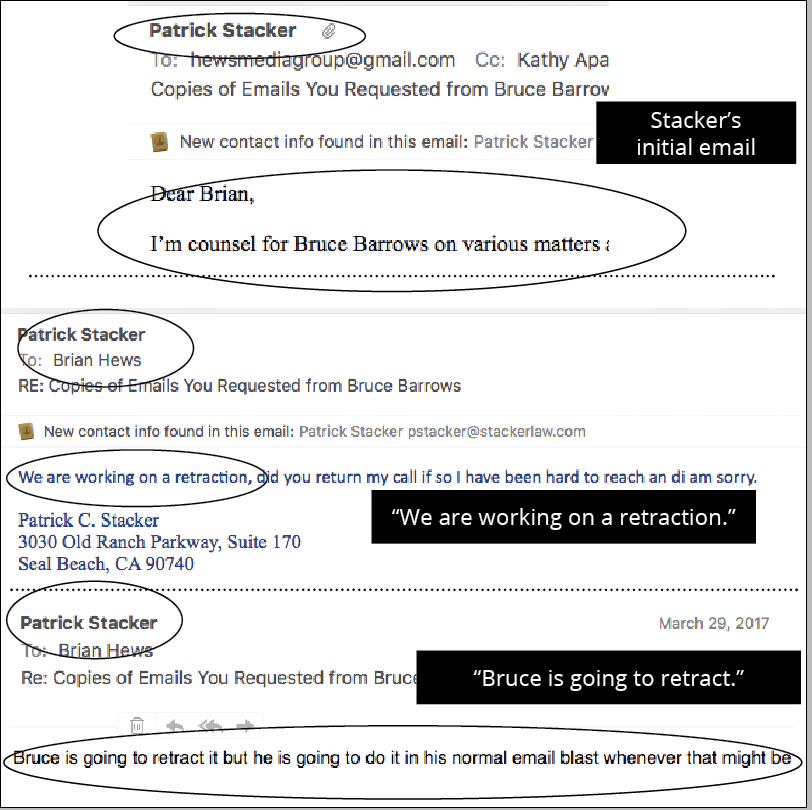 Hews stated, “I have emails from Patrick Stacker that said, and I am quoting, ‘I’m counsel for Bruce Barrows on various matters…..we are working on a retraction…Bruce is going to retract it but he is going to do it in his normal email blast whenever that might be in the near future. I think he has 10 days after the request to be honest with you. Do you think he legally has to do it sooner?’ It is clear he wanted to retract, this is pure intimidation.”