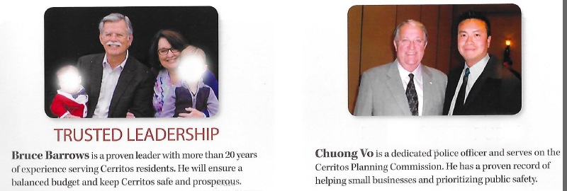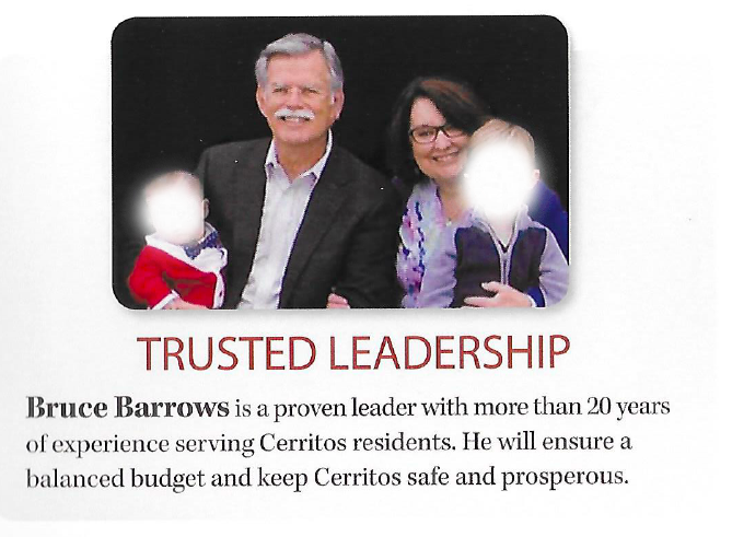 SUPPORT FROM OUTSIDE SOURCE: Part of the mailer that hit Cerritos homes today from Biz Fed’s political action committee, Barrows is shown with his grandkids. HMG-CN blurred their faces, in the mailer that Biz Fed sent out, their faces were not blurred.